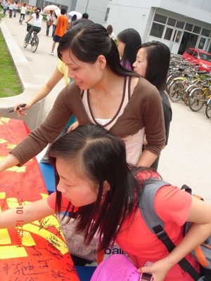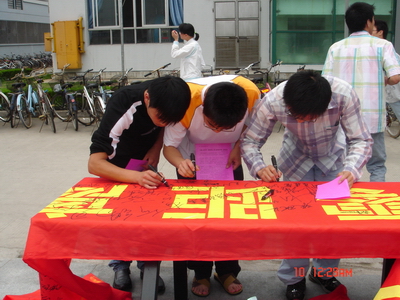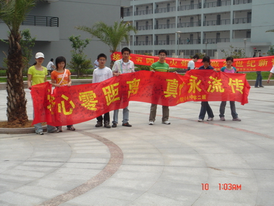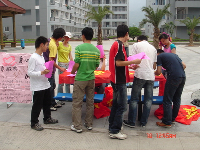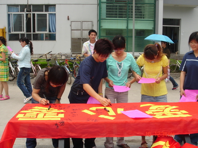 五月十二日,bat365在线中国官网登录入口04中本二班团支部的同学们在C北区的活动广场开展了“爱心零距离,真情永流传”的主题团日活动。五月的骄阳炙烤着大地,但是,为了能让更多的人了解爱心超市,关注爱心超市,同学们还是选择了在中午这个人流量最多的时间段。活动中,以海报的形式向生活区的同学老师介绍了爱心超市的一些具体情况和超市目前所存在的困境,呼吁全体同学向他们伸出援助之手。本班全体同学在印有“爱心零距离,真情永流传”的爱心横幅上签名,接着我们向生活区的同学发放了宣传单,他们也在爱心横幅上签名。