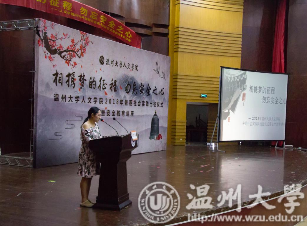接着,由江萍老师为全体实践队成员作了安全教育讲座。她从人身、财产、交通以及住宿安全,常见疾病及意外伤害,语言风俗文化差异,天气状况变化等方面,事无巨细地对同学们进行了叮嘱。防患于未然,要切实增强大学生的安全与责任意识,提高学生自防、自治、自救、自卫能力,从而更好的保障自身在参与暑期社会实践的人身及财产安全,确保暑期社会实践的顺利进行。然后,由实践队队长代表发言。"畲情之约"和"彩虹行动"的两位实践队队长上台发言,他们再次强调了安全问题,并展现了自己的决心,要秉持学院优良传统,发挥志愿精神。之后,各实践队队长上台签订安全协议书,并由倪晓晓老师为bat365官网的11支实践队授旗。最后,全体实践队队员起立,宣誓自愿成为一名光荣的社会实践志愿者。