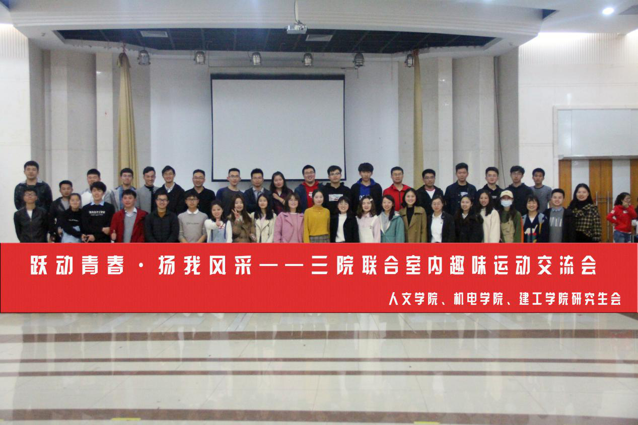 2019年4月13日晚六点半,我院研究生会联合建工学院和机电学院研究生会在大学生活动中心A301教室成功举办了以“跃动青春,扬我风采”为主题的研究生室内趣味运动会,来自不同学院的六十余位学生参与其中。