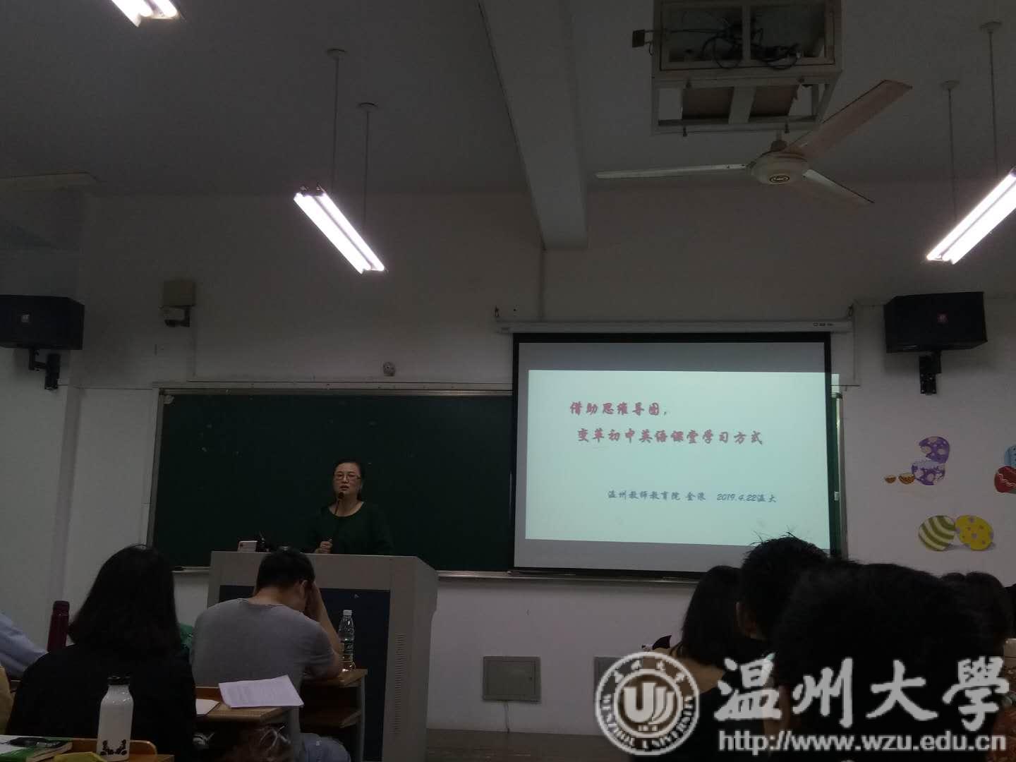 2019年4月22日上午,16英语(师范)班的同学们在外语楼迎接了金浪老师及其工作团队。这是16英语(师范)教育研习的第一天,上午的时候同学们聆听了温州教师教育院的市级名师金浪的《借助思维导图,变革初中英语课堂学习方式》的讲座。然后观摩了来自温州八中的李思思老师的听说课《Let it rain》,这是一堂温州市赛课二等奖。李思思老师非常年轻,但是经验十足,在她的课堂中让学生获益匪浅,在课堂中渗透情感教育,告诉学生凡事都具有两面性,需要一分为二地看待事物,保持积极乐观的心境是最为重要的。这是一堂活泼生动的优质课,让同学们充分感受到了年轻老师的活力与潜力。随后进行了学员分组研课、互动评课,金浪老师主评,并解答了大家的疑问。下午,金浪老师带来了题为“初中英语话题教学的目标制定与达成”的讲座,让16级师范从一种研究的视角去看待教学问题。