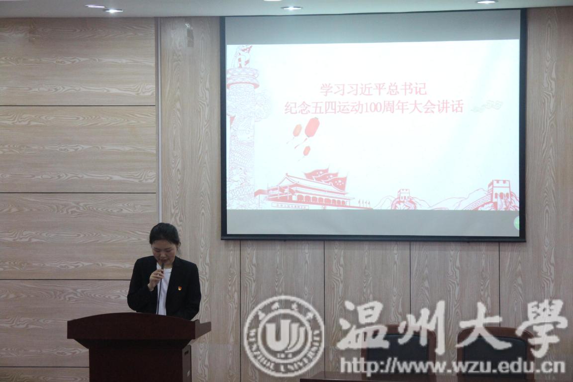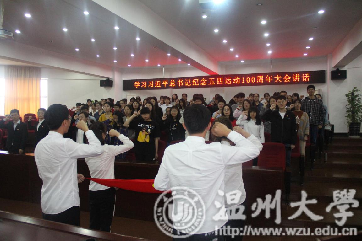 活动伊始,全体起立,奏唱共青团团歌。在激情洋溢的团歌之后,党员代表李林军同学回顾五四历史、传承五四精神,从自身经历出发,跟同学们分享如何从一名团员成长为一名党员的历程。在全体人员重温入团誓词与入党誓词后,集体观看纪念五四运动100周年大会,一起感受那永不衰竭的五四精神。会上,习近平总书记对广大青年寄予厚望:“新时代中国青年要继续发扬五四精神,以实现中华民族伟大复兴为己任,不辜负党的期望、人民期待、民族重托,不辜负我们这个伟大时代。”