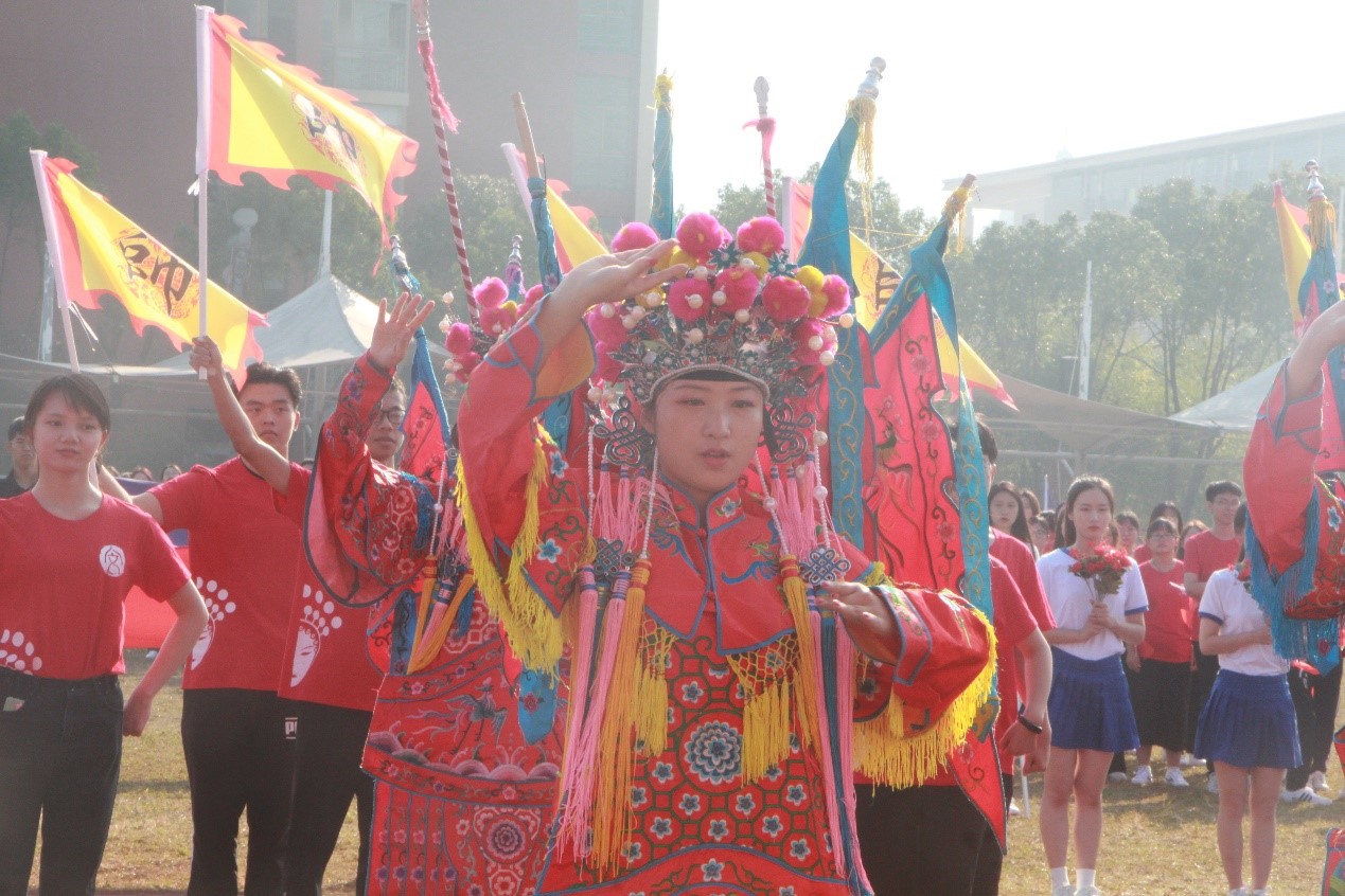 开幕式上,伴随着激昂雄劲的运动员进行曲,国旗、校旗、会旗三面旗帜缓缓入场。接着是各学院的方阵,他们迈着整齐有力的步伐依次经过主席台。bat365官网方阵用一段南戏表演《穆桂英挂帅》向本次运动会致敬,七个“穆桂英”身穿帅服,姿态与招式之间展现了穆桂英挂帅之后豪气万丈、气贯长虹的将帅风采。两侧的同学或手执长枪,或紧握旗帜,整齐有序,发出“嘿吼嘿吼”的口号声,更添磅礴气势。为了这短短的几分钟,方阵队员们在落日余晖中一遍又一遍地编排,在漆黑寒冷的晚风中一次又一次练习,汗水的付出得到了回报,这一精彩的表演赢得了阵阵掌声。