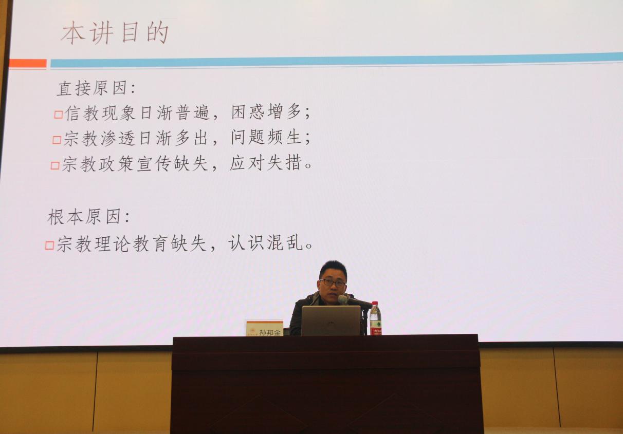 2020年12月9日13:30,我校马克思主义学院孙邦金教授在南校9号楼报告厅为bat365官网2020级全体新生带来了一场以“中国的宗教现状与宗教政策”为主题的讲座。
