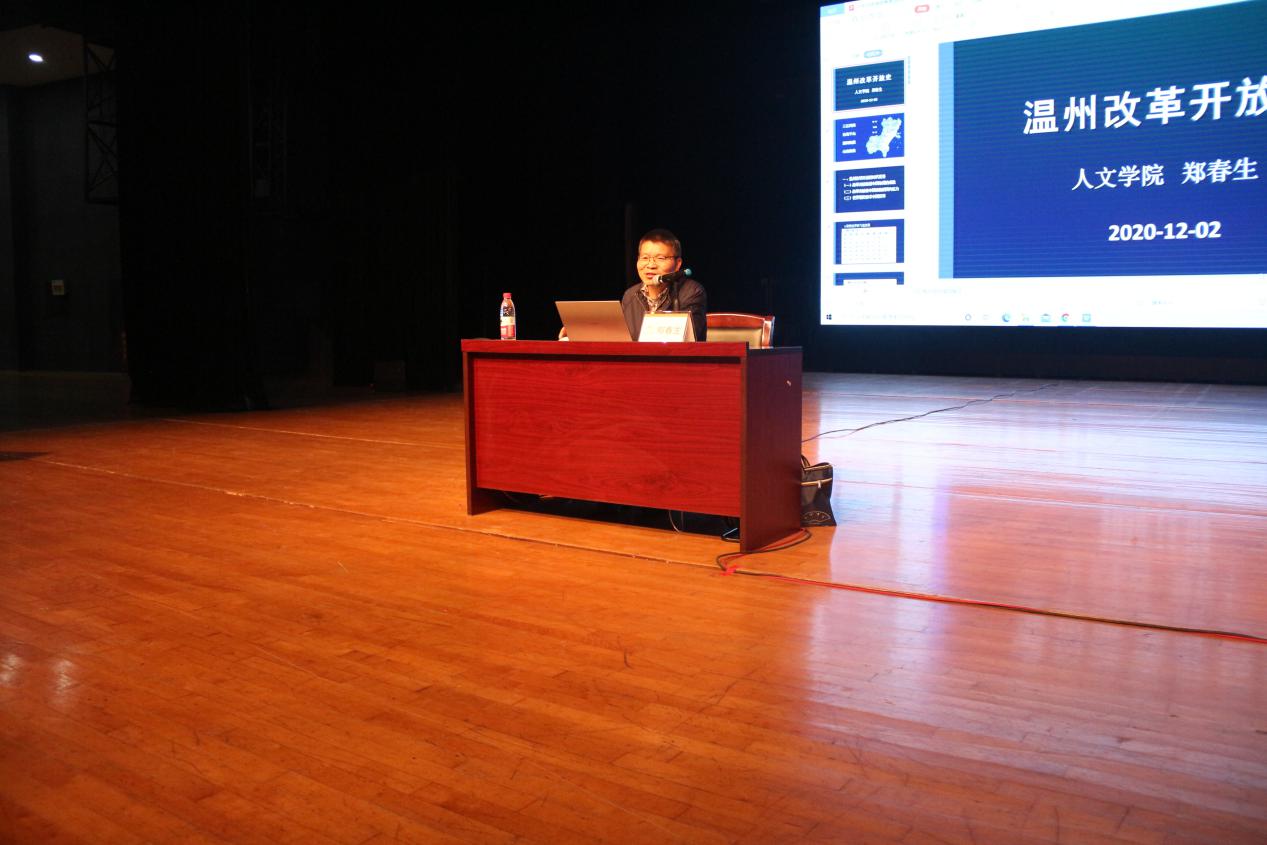 郑春生老师主讲的课程以“温州改革开放史”为主题。他分别从温州改革开放的时代背景、温州历史上的对外开放、温州在争议中改革、温州开放大事记四个方面讲述温州改革开放的艰难与成就,郑老师说:“温州模式的经验教育值得研究。”