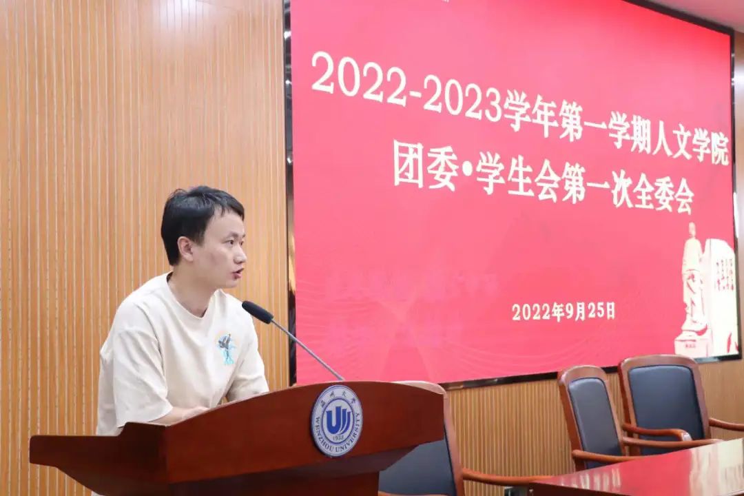 秋风始至,排云初展。9月25日,bat365官网团委·学生会2022-2023学年第一学期第一次全体委员会于人文楼203报告厅召开。bat365在线中国官网登录入口学工办副主任兼团委书记申业磊老师,学工办辅导员谭黄老师,团学主席团及全体团委·学生会成员悉数与会。
