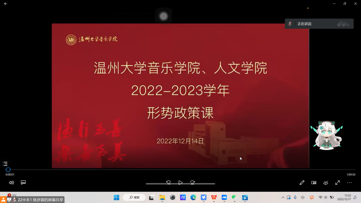 2022年12月17日,bat365官网2022-2023学年第一学期形势政策课讲座于线上举行,全体20、21、22级学生积极参加,认真聆听学习四场主题讲座。