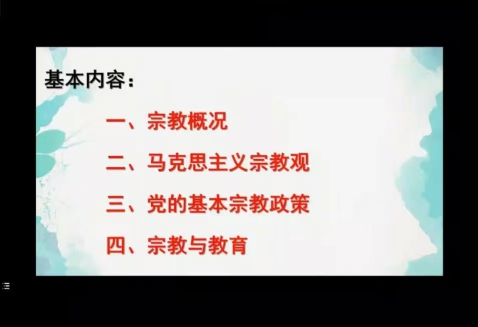 马克思主义学院梁家荣老师从宗教概况、马克思主义宗教观、党的基本政策及宗教与教育四方面展开了详细阐述与分析。他表示,作为新时代的新青年,既已生逢其时,更当肩负起时代赋予我们的重任,主动了解各类宗教背景,掌握相关知识与法规,并树立起积极的世界观、人生观与价值观,以自我实际行动维护党的基本宗教政策。