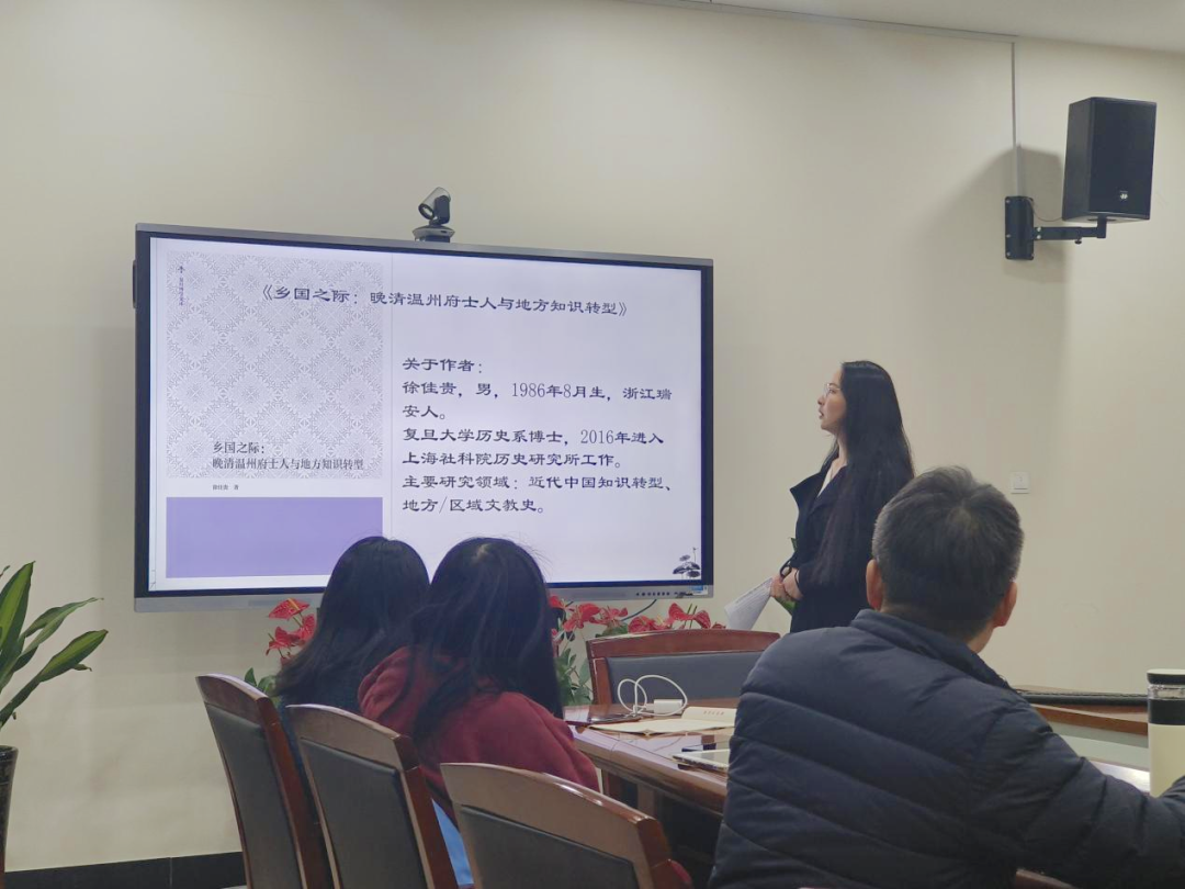 马梦阳同学为大家分享的是《乡国之际:晚清温州府士人与地方知识转型》一书。她介绍了温州士人科举崛起后对于地方国族构建的积极作用。同时,又指出行政层级相匹配的文教分层制度导致温州进一步边缘化。最后,马梦阳同学认为将“地方”置于“知识转型”之前,有利于检视晚清知识转型“地方化”的机制与限度。