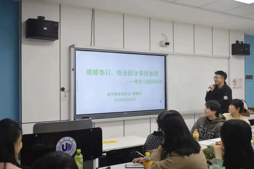 商学院研究生会执行主席陈维奇以学生权益维护与日常活动开展为主题,介绍了商学院研究生会主持举办的“赴洞头开展研学活动”“师生趣味运动会”等活动,并向大家展示了活动的精彩瞬间与相关图文推送,陈维奇由此提出三条活动开展的建议:第一点,活动开展要有背景;第二点,尽可能地带大家走出去;第三点,提高大家参与的积极性。