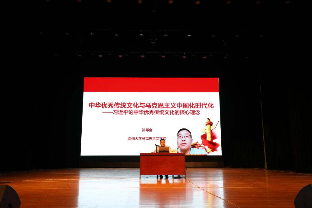 bat365在线中国官网登录入口马克思主义学院副院长孙邦金教授从二十大精神及传统文化的相关论述出发,讲述了中华文明的突出特性、精神标识和文化精髓,并基于新时代中国特色社会主义文化发展道路具体阐释了中华优秀传统文化与马克思主义基本原理相结合的时代路径,为同学们解构了中国式现代化的文化形态。他表示,身为新时代的新青年,我们既要坚定文化自信,又要秉持开放态度,更要坚持守正创新;担青年使命,承文化底蕴,在历史的新起点赓续中国文脉,谱写当代华章。