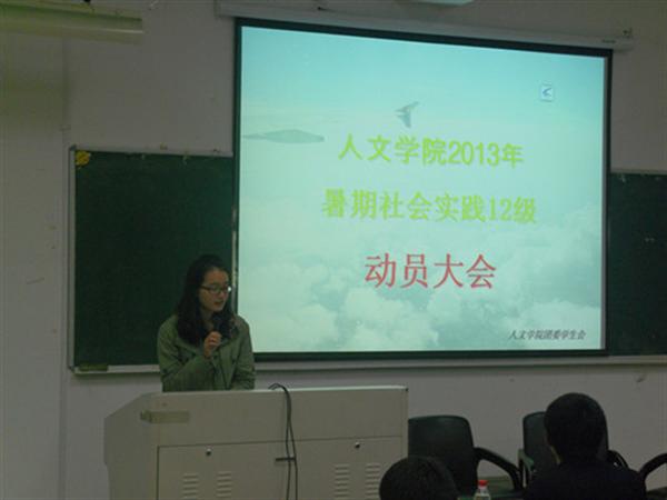 3月24日晚18:30分,2013年暑期社会实践12级动员大会在人文楼101教室举行。到会人员有学院辅导员曾蓓蕾老师,学院团委学生会主席杨立忠,副主席张哲,马哲,屠焕青以及12级全体新生。