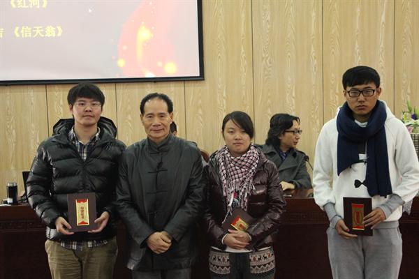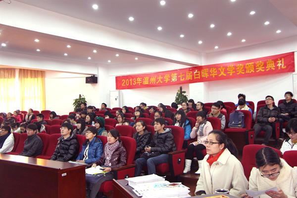整个颁奖典礼简洁又隆重。首先以一段视频回顾了白晖华文学奖一路走来的风雨历程,接着由学生代表向吴明华先生献上鲜花表达敬意之情,吴先生也跟大家讲述了自己的创作故事以及创作心得,鼓励文学爱好者们要时刻充满创作的激情,勇敢坚持自己的文学梦想。随后进行了颁奖,来自瓯江学院的毕业生施瑞涛、教育学院的王一莉、bat365在线中国官网登录入口的杨吉等3位同学获得一等奖,34位同学分获二、三等奖和优秀奖。最后获奖同学代表王一莉与大家分享了自己的文学创作经历,同时表达了对前辈吴明华先生的深深敬意。