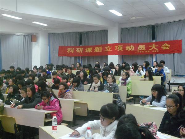动员大会开始后,首先由科协负责人对立项做了详细的介绍,其中包括立项的概念,立项的具体流程,立项的注意事项,以及往年的立项情况,同时还介绍了有关科研立项的一些大型赛事,例如:新苗人才计划,“挑战杯”大赛等。在同学们对科研立项有了大致的了解后,12级广告学专业顾晨娴同学通过讲述自己的立项与同学们分享了自己的立项过程和经验,并悉心为广告专业的同学解答疑问。11级历史专业潘立川同学从历史专业的选题、切入点等方面作了详细解释,并且希望同学们在立项的过程中要注重实际,注重自身写论文能力的培养。12汉语言文学专业王晴川同学也针对中文专业的立项为同学们带来了精彩详细的PPT,并对立项的流程,立项之前之后的工作,立项中的困难以及应对措施等等一系列问题展开了详细的解说。