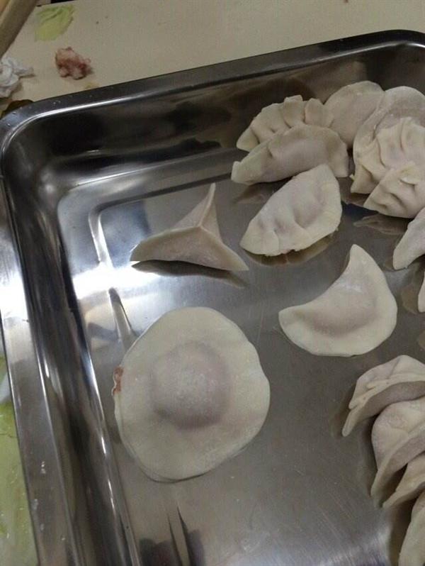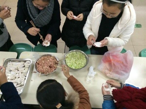 首先,同学们在桌边围成一团做饺子馅:切菜,剁肉,搅拌。如此,一锅饺子馅便做成了。然后,在有包饺子经验的同学们的指导下,同学们开始有模有样地包饺子。第一次的尝试带来了奇形怪状的饺子,但随着同学们动作的娴熟,饺子也渐渐规整了起来。也有同学奇思妙想,做出了一个个像金元宝、帽子、荷包蛋、香包等等异乎寻常的饺子。同学们还利用多余的蔬菜包裹着猪肉做了创意“菜包肉”。把多余的猪肉被揉成团,做成肉丸。热乎乎的饺子,外脆里嫩的“菜包肉”,香喷喷的肉丸子,三种美味,齐聚桌上。大家一起吃着美味,一边回忆2014,期盼2015,畅谈人生理想。