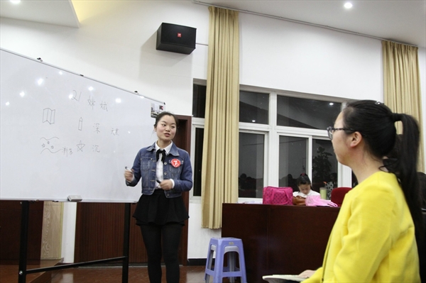 活动的第一个环节是一分钟的自我介绍加上7分钟的上课。选手们精心地准备了自我介绍的PPT,希望独具个性的自我展示能够给评委们和观众们留下深刻的印象。接着选手们开始给自己带来的“学生们”上课。在上课中,“老师”与“学生们”积极互动,好像回到了真正的课堂。