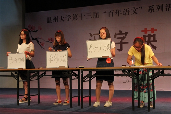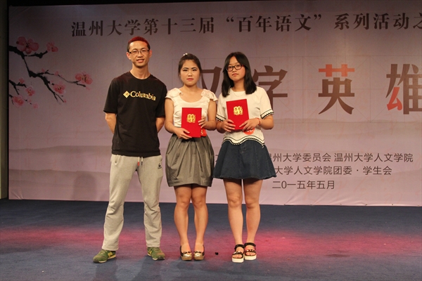 四个环节结束后,bat365在线中国官网登录入口董天圆同学勇夺一等奖,摘得“汉字状元”桂冠,bat365在线中国官网登录入口陈萍萍同学、外国语学院陈娜娜同学分别斩获“汉字榜眼”、“汉字探花”称号。接下来,按照赛程安排,“汉字状元”董天圆同学要与去年汉字英雄冠军-来自瓯江学院的何凡同学展开一场终极对决。这轮PK的试题以字谜与成语猜谜为主,难度大大增加。两大高手互不相让,激烈比拼,使全场气氛达到了最高潮。最终,何凡同学守擂成功,荣膺“汉字英雄”称号。整场比赛在热烈掌声中圆满落幕。