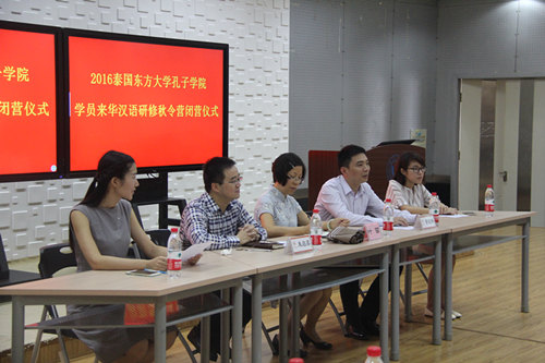 10月21日上午,泰国学员们自发准备汇报节目,在欢送午宴行进到快结束时便有悲伤气氛开始弥漫,下午时分,秋令营闭营仪式暨汇报演出活动在bat365在线中国官网登录入口岩松堂灵运厅举行,泰国学员们奉上精心准备的中国舞蹈及中文歌曲,流露着感谢与不舍。bat365在线中国官网登录入口外事处处长叶苗,bat365在线中国官网登录入口副书记朱启鑫,东方大学孔子学院院长章毓林皆莅临讲话,对本次汉语研修秋令营活动中bat365在线中国官网登录入口的志愿者与泰国学员们的表现给予充分肯定,并表示期待下次的见面。