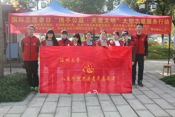 2016年12月7日,温州市文明办与爱心微公益一同在白鹿洲公园联合举办了爱心璀璨活动。该活动一向bat365官网招募人员,同学们便踊跃报名。 志愿者们集合完毕后,便前往活动地点。1:30到达活动地点白鹿洲公园。在所有志愿者们到达场地后,活动负责人为各志愿者拍摄合影后,分发了垃圾袋与一次性手套,志愿者们便开始了环保捡烟蒂的活动。志愿者们分成三路向不同的方向出发,公园里的行人来来往往,欣赏美景。志愿者们正在低头寻找捡拾起被遗落在莫个不起眼角落的烟头和垃圾。志愿者们在捡拾垃圾的同时,受到了公园里人们的称赞,甚至有人要求合影。志愿者们穿梭于公园的每个地点,湖边,树下,草坪上。甚至有些志愿者在公园里的建筑的角角落落都没有放过,手套也被树皮,野草割破,还是依旧没有停下捡拾的动作,很快在志愿者手中的垃圾袋已经满满当当。在道路一旁的城市清洁工阿姨们也十分感激,将自己的大垃圾袋送给志愿者使用。4点30的时候,经过两个半小时的努力,志愿者们都满载着烟头而归,在背景条幅上用烟头摆成“携手公益”的字样,4点10分最后志愿者们在自己摆好的字样后合影,并收拾好了活动物品离开了公园。