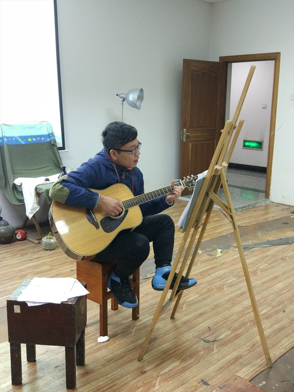 姜晨老师整理了一些自己课下练习当中发现的,需要强调的注意事项,在这最后一节课中嘱咐大家,作为整个培训课程的收尾。他首先讲到,弹吉他要配有一个变调夹,其作用是帮助弹奏者找到最舒服的调,以及最适合弹唱的音域。通过调节变调夹演示其产生的不同效果之后,姜老师又为大家讲解了一些和弦的乐理知识,比如和弦的区分、常用调式的区分等。他详细分析了大三和弦与小三和弦的区分作为示例。此外,他还讲到“爬格子”的联系方法对提高手指灵活性很有帮助,独奏纯旋律对“爬格子”的要求很高,并且要同时熟悉变调;而如果弹唱,对其要求相对低一些。讲完了课程内容后,姜晨老师深情地弹唱了一首《那些花儿》,动人的歌声和着音乐的情怀,感染了在场的每一个人。最后,姜晨老师与全体学员留影,以纪念本学期的吉他素拓培训课程圆满结束,也纪念大家一起度过的快乐时光和留下的美好回忆。