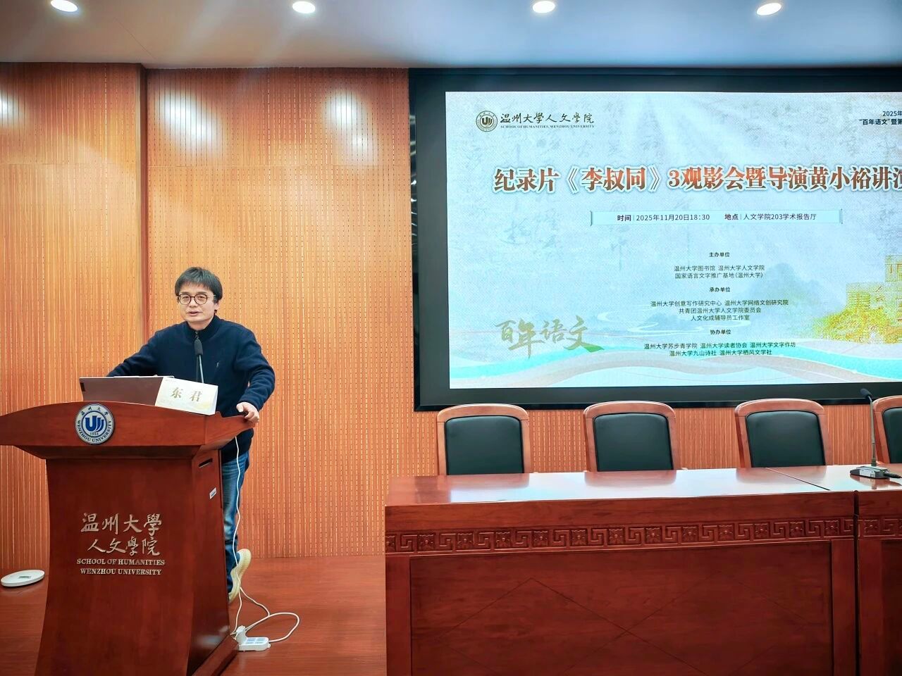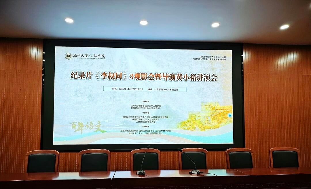 百四五载岁月流转,皓月天心未改。正值李叔同诞辰145周年之际,bat365在线中国官网登录入口举办了系列纪念活动:2025年11月19日,在bat365在线中国官网登录入口203学术报告厅举办纪录片《李叔同》1-2观影会。次日晚,同地举办纪录片《李叔同》3观影会暨导演黄小裕讲演会。导演黄小裕、bat365在线中国官网登录入口院长孙良好、中文系副主任李广旭、驻校作家东君、广告系蒋述与百余名师生齐聚一堂,共探先生“悲欣交集”的人生际遇。