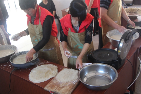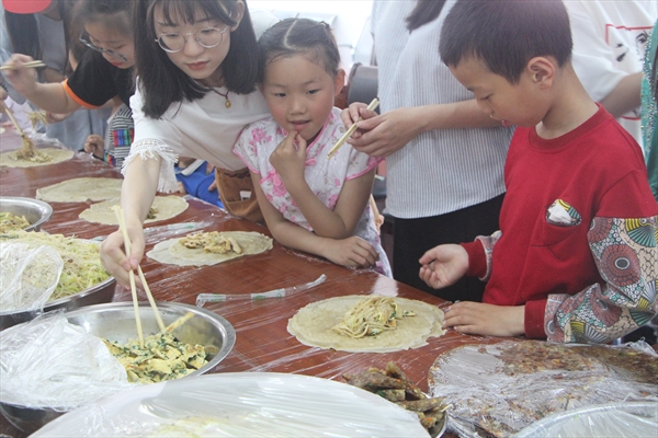一早,志愿者到达尚古山村村民中心,并与当地相关负责人沟通对接后开展了乐清芙蓉小吃——麦油煎饼的制作。志愿者与孩子及其母亲一一对接,在简单的交流后,孩子母亲向志愿者详细介绍了“麦油煎饼”的由来及制作方法。过程中,志愿者也与孩子积极互动,了解孩子与母亲的相处模式,在做小吃的同时,不忘进行相关母爱教育,号召孩子平时多与母亲沟通交流,做一些简单的家务来分担母亲的劳累。在当地妇联成员的带领下,志愿者与孩子一同制作了麦饼皮子。过程中,孩子也十分热情地向志愿者演示了制作方法,志愿者当然也不甘落后,帮着妇联成员和面粉,并用手将面糊摊平,时不时地给麦饼翻个面。虽然过程当中,志愿者的动作有些生疏,但在大家的努力下,一个个麦油煎饼出炉,造型也很标致。通过手把手的辅导,给孩子与母亲一个相互接触的机会,大家面对面的交流,舒缓了紧张的家庭关系。制作现场其乐融融,笑声不断,有鼓励的,也有关爱的。