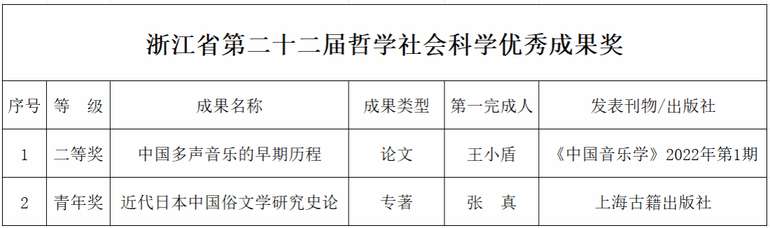 近日,浙江省第二十二届哲学社会科学优秀成果奖获奖名单揭晓,bat365官网王小盾教授的论文《中国多声音乐的早期历程》获批基础理论研究优秀成果二等奖,张真副教授的著作《近代日本中国俗文学研究史论》获批基础理论研究优秀成果青年奖。