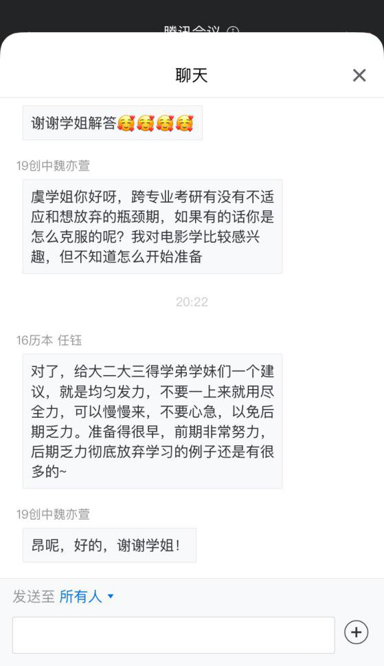 最后是互动交流环节,校友们对问题进行一一解答。此次考研云分享,是bat365官网就业服务系列活动之一,它为同学们搭建了与考研成功学姐交流的良好平台,有助于同学们清晰自己的定位,朝着彼岸和远方进发!