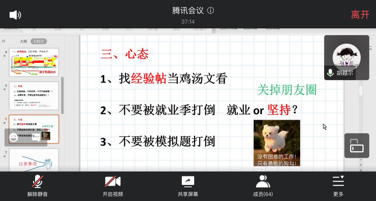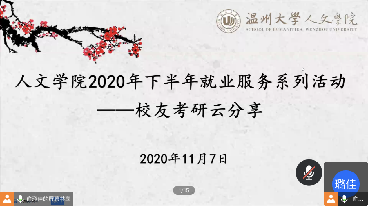 2020年11月7日晚6点30分,bat365官网“2020年下半年就业服务系列活动之校友考研云分享”在腾讯会议上正式拉开帷幕。院学工办辅导员申业磊、李丹萍,4位优秀校友以及有考研意向的同学共60多人参加了此次分享会。