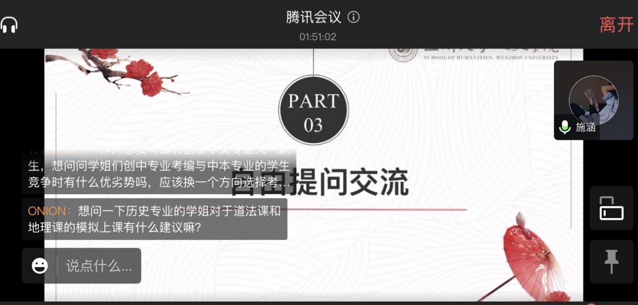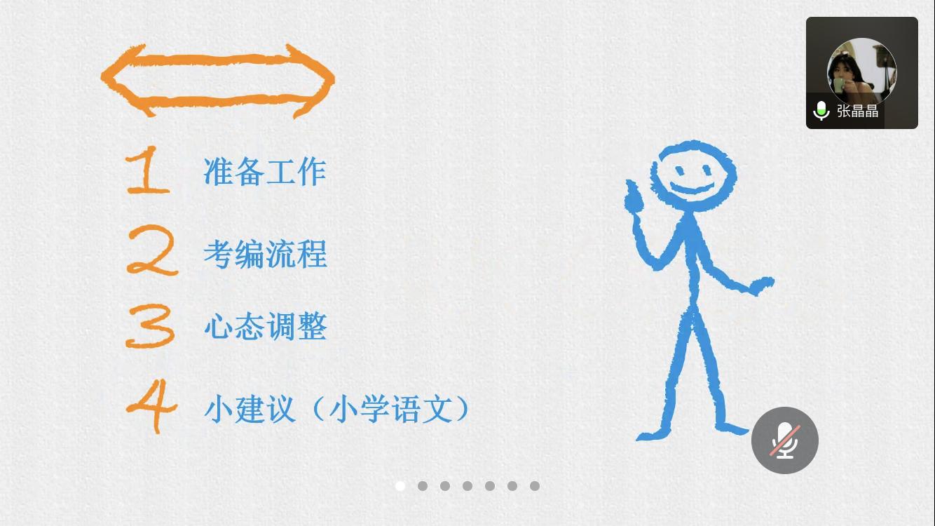 会议伊始,院学工办辅导员李丹萍老师阐明举办云分享活动的初衷与远景,期望大家都能有所收获,并感谢校友对母校工作的大力支持。随后是校友分享环节。毕业于17中文2班的张晶晶学姐就前期准备工作、考编流程、心态调整与小学语文备考的一些小建议四个方面展开经验分享。她强调自信、亲和力与礼貌是面试与试课中的重中之重,认真地研读课文亦是成功的基石。17历史(师范)班的施涵学姐以“工欲善事先利器”、“巧干亦能捕雄狮”、“它山之石可攻玉“、“风物长宜放眼量”等数句古语为主题,向大家提出了数点宝贵的意见,希望大家能做好自我成长规划,“凡事预则立,不预则废”。目前工作于杭州湖畔学校的17中文1班邢柏怡学姐,以她的座右铭“千里之行,始于足下”为主题具体讲述了她的考编历程。学姐强调,要做一个有心的人,关注学校的校史校情。17历史(师范)班的叶梦炯学姐主要分享了信息获取的来源、考编历程与复习流程,她建议大家放平心态,多做尝试,重在积累。