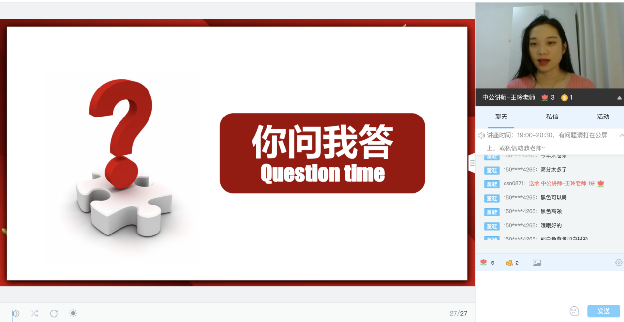“自信很重要!如果你能够自信地侃侃而谈,那么你的面试就成功了一半!”王玲老师如是而言。她指出,面试的本质是通过考官与考生面对面的信息沟通或行为观察,来考查考生的知识、经验、能力等能力和个性品质。它和笔试的最大区别就在于其形式灵活且具有不确定性,因此就需要考生提前做好充分的准备来沉着应对突发情况。同时,由于近几年面试采取线上的形式进行,我们还需构建好自身的网络环境、视觉环境与听觉环境。