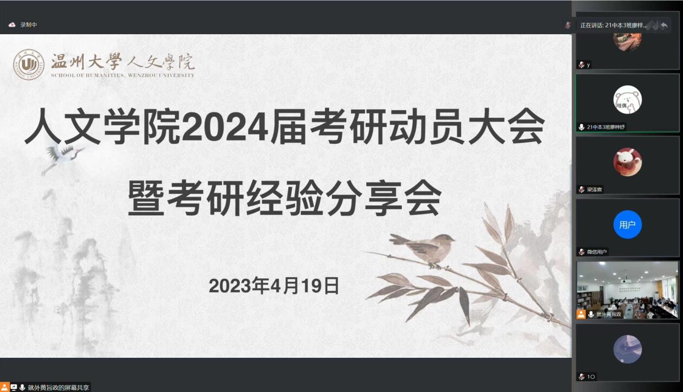为了帮助考研学子们全方位、多层次、多角度地认识、了解考研,做好备考规划,4月19日下午,我院以线上线下相结合的方式举办了2024届考研动员大会暨考研经验分享会。院党委副书记魏一、学工办副主任申业磊、辅导员李丹萍、四位优秀研究生代表、24届意向考研同学参与。