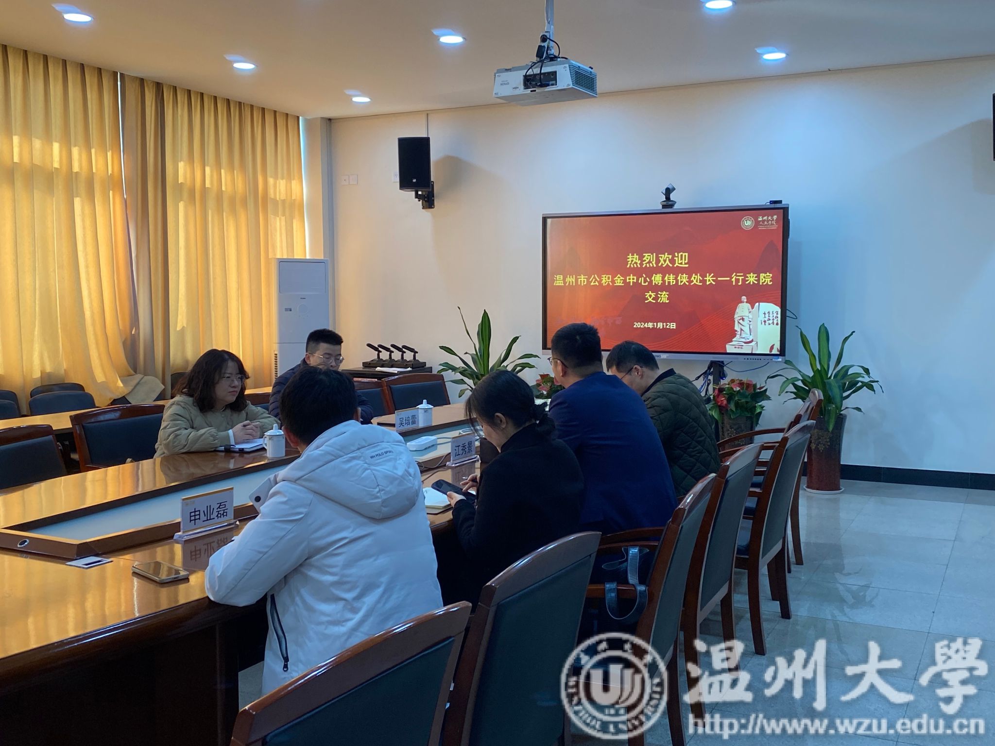为促进毕业生留温和高质量充分就业,2024年1月12日上午,温州市住房公积金管理中心傅伟侠处长一行来bat365官网交流,洽谈合作事宜。院党委书记江秀景、bat365在线中国官网登录入口招生与就业处副处长魏晓晓、院党委副书记魏一、学工办副主任申业磊、辅导员李丹萍参加座谈会。