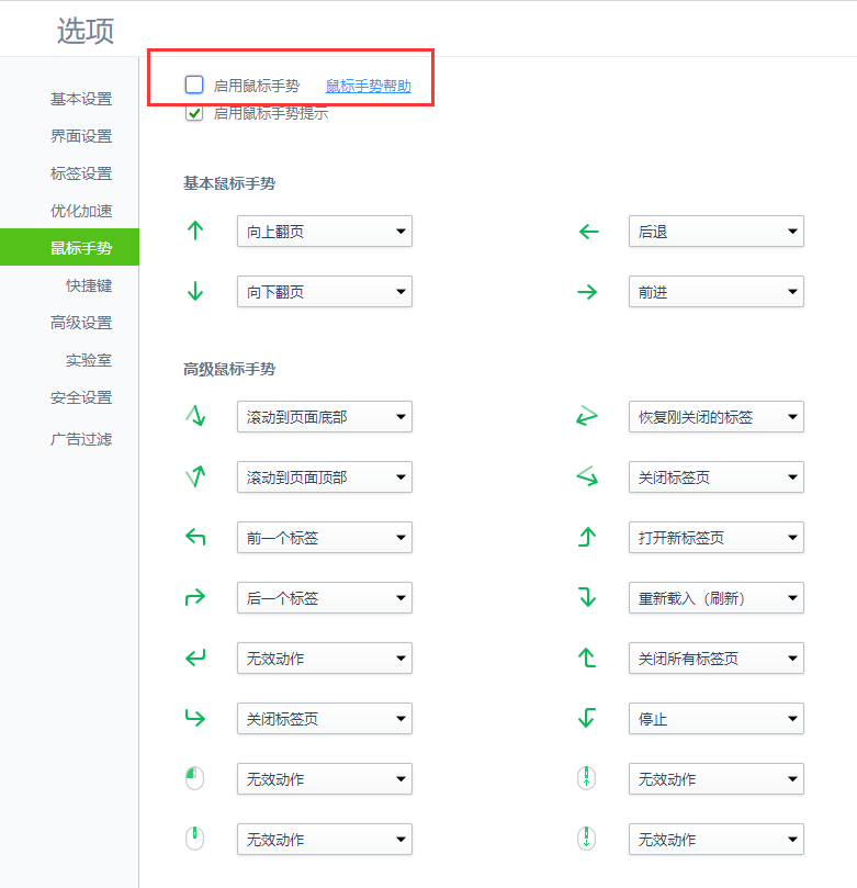 点击【鼠标手势】,把启用鼠标手势前面的“对勾”去掉,关闭鼠标手势。