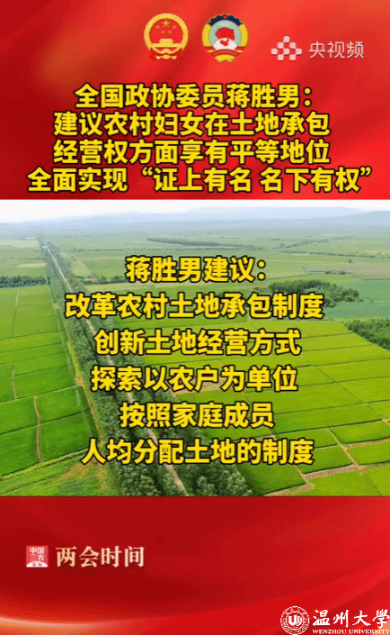 因此蒋胜男建议,改革农村土地承包制度,创新土地经营方式,探索以农户为单位,按照家庭成员人均分配土地的制度,使农村妇女在土地承包经营权方面享有平等地位,能够全面实现“证上有名、名下有权”。