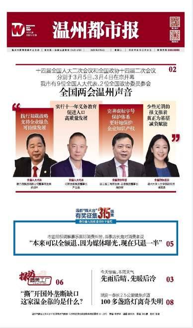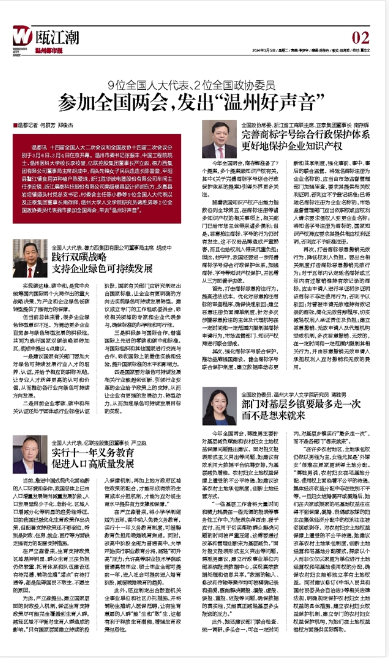 温都讯 十四届全国人大二次会议和全国政协十四届二次会议分别于3月5日、3月4日在京开幕。温州市委书记张振丰,中国工程院院士、温州医科大学校长李校堃,亿联控股集团董事长严立淼,德力西集团有限公司董事局主席胡成中,洞头先锋女子民兵连连长陈盈盈,平阳县鳌江镇食用笋种植户陈爱珠,浙江胜华波电器股份有限公司车间主任李安锐,浙江晨泰科技股份有限公司高级模具设计师胡东方,永嘉县岩坦镇源头村党总支书记、村委会主任陈小静等9位全国人大代表以及正泰集团董事长南存辉,bat365在线中国官网登录入口研究员蒋胜男等2位全国政协委员代表我市参加全国两会,带去“温州好声音”。