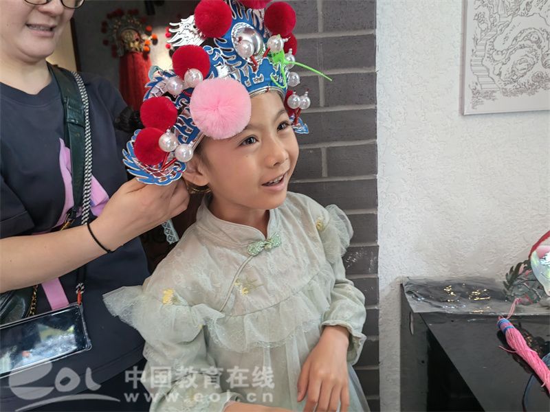 各校友家庭相聚于浙江传统戏曲研究与传承中心,在讲解老师的引导下,深入了解了南戏的起源和发展历史。孩子们被丰富的戏曲文物、珍贵的历史资料吸引,不时发出赞叹之声,戴上做工精巧的头饰,切身感受南戏艺术的魅力。