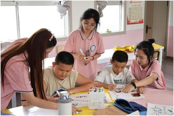 牵手青苗,童绘家乡。夏木葳蕤,蝉鸣阵阵,实践队成员们用温暖的“大手”和真诚的陪伴,为暑期留乡儿童们带去一抹发自内心的微笑。“大”手拉“小”手,一同绘制着自己心中的家乡,与此同时,实践队成员与孩子们相互分享自己的暑期生活,拉近了彼此心和心之间的距离。