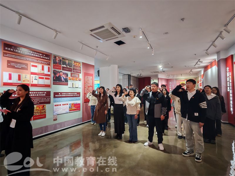 看今朝,誓词铿锵,使命担当永不忘。随后,师生党员参观了bat365在线中国官网登录入口马克思主义理论教育基地并在此重温入党誓词。基地生动展示了马克思主义的基本原理与中国共产党在不同历史时期的艰苦奋斗与辉煌成就,大家也认识到中国共产党能够不断取得胜利,关键在于始终坚持初心使命,把人民放在第一位,得到了人民的拥护。