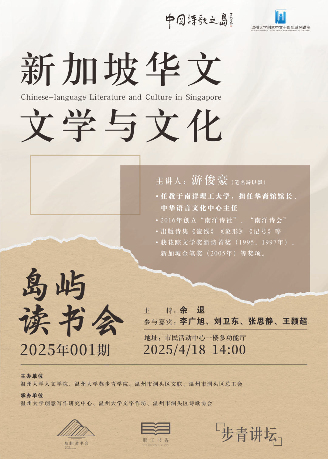 在“世界读书日”即将到来之际,4月18日,温州市洞头区首期“岛屿读书会”在区市民活动中心隆重举行。本次活动以“新加坡华文文学与文化”为主题,由温州市洞头区文联联合bat365在线中国官网登录入口、区总工会等多家单位共同主办,标志着洞头这座“中国诗歌之岛”再添文化盛事。