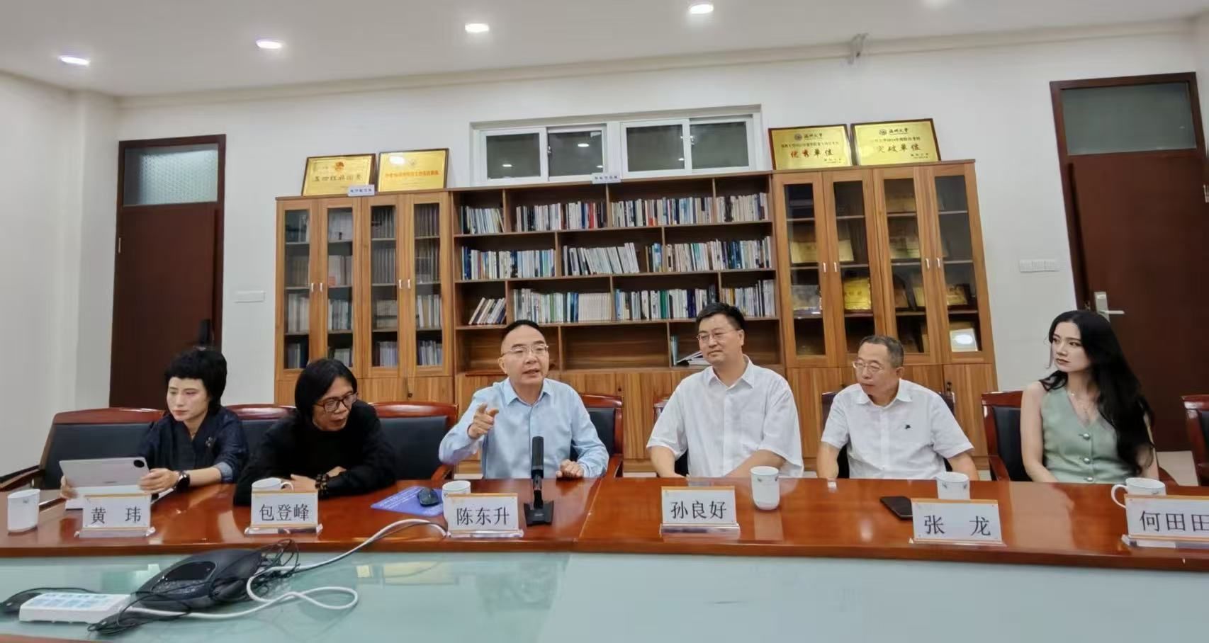 主题分享结束后,三位与谈嘉宾张龙、包登峰、何田田三人先后从市场化媒体环境与文学创作、党政法治宣传实践、媒体人的职业精神分别分享各自的感悟与见解。本院院长孙良好教授对本次讲座进行总结,并代表学院向校友陈东升教授赠送“贤庆校友论坛”感谢状。